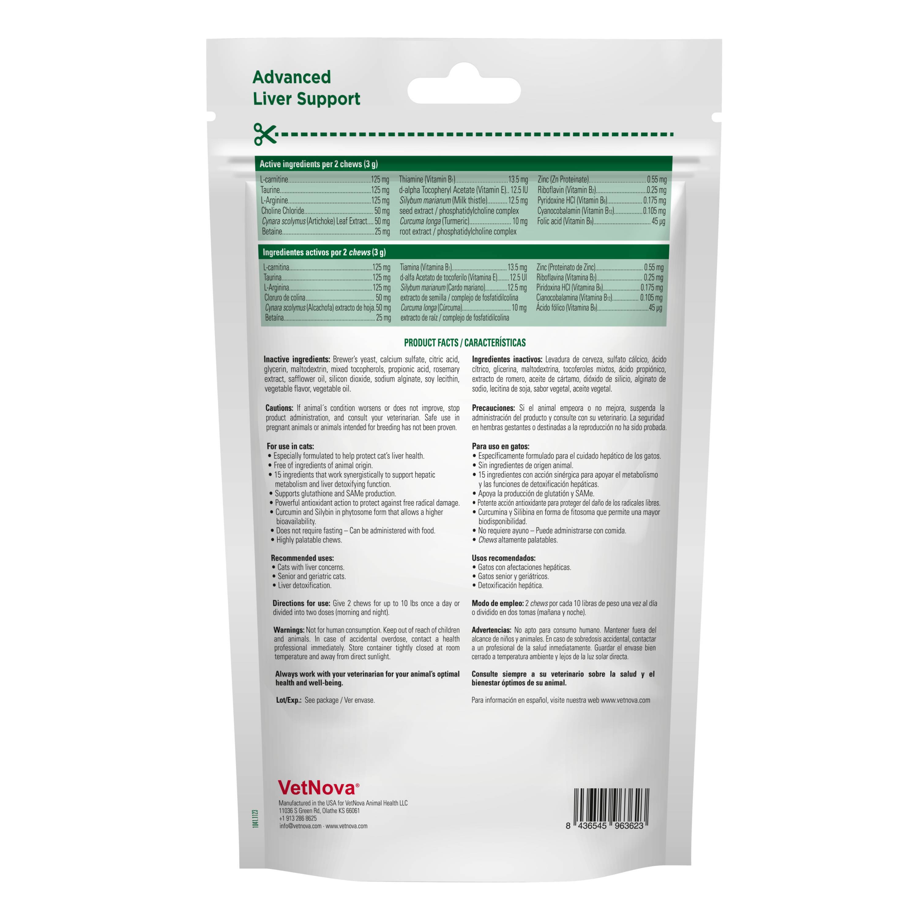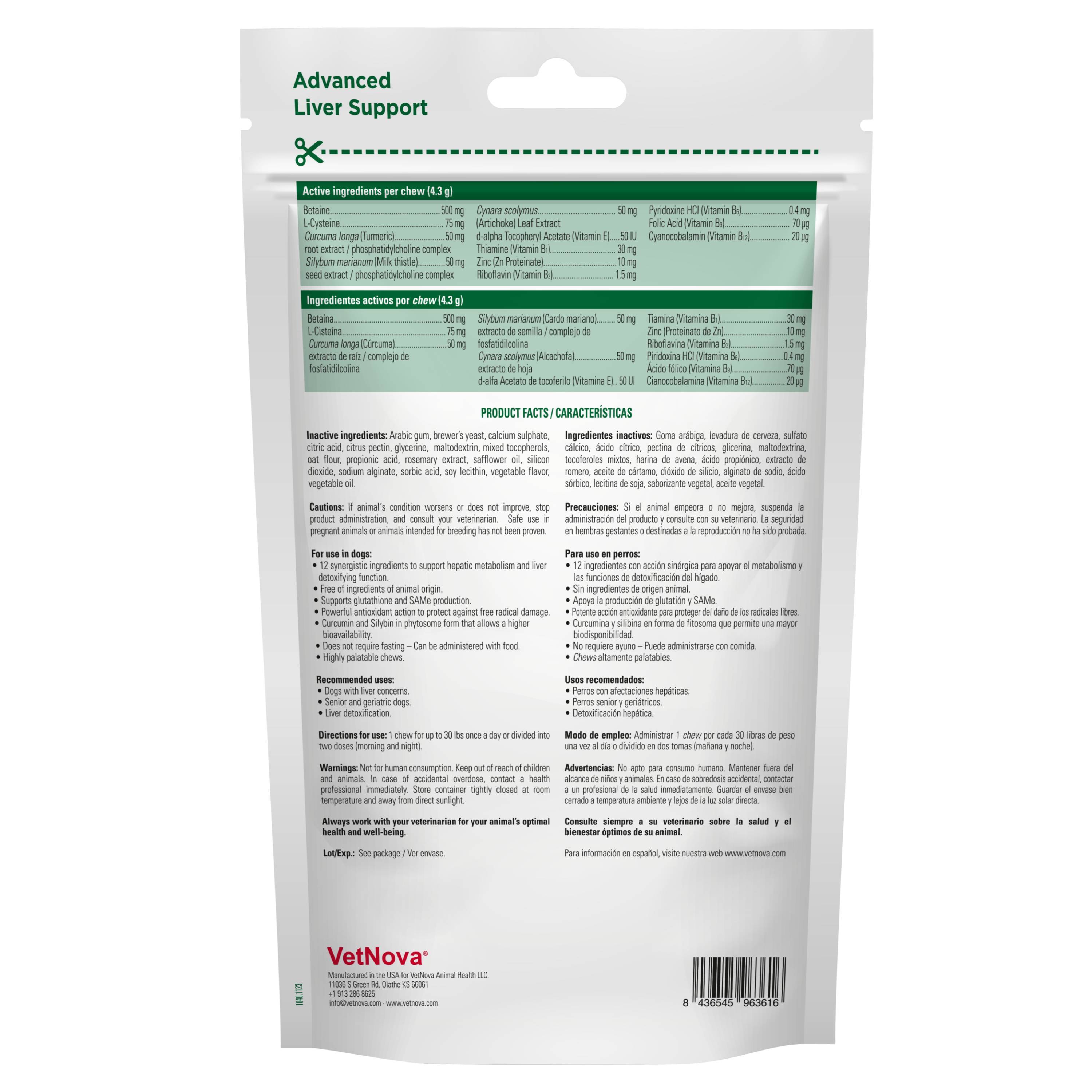 - Active ingredients per 4.3 g chew: Silybum marianum (Milk thistle) seed extract / phosphatidylcholine complex 50 mg, Curcuma longa (Turmeric) root extract /phosphatidylcholine complex 50 mg, Cynara scolymus (Artichoke) leaf extract 50 mg, Betaine 500 mg, Cysteine 75 mg, Thiamine (Vitamin B1) 30 mg, Riboflavin (Vitamin B2) 1.5 mg, Pyridoxine HCl (Vitamin B6) 0.4 mg, Folic Acid (Vitamin B9) 70 μg, Cyanocobalamin (Vitamin B12) 20 μg, d-alpha tocopheryl acetate (Vitamin E) 50 IU, Zinc (Zn Proteinate) 10mg.