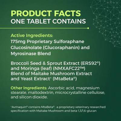 - Active Ingredients: 175mg Proprietary Sulforaphane Glucosinolate (Glucoraphanin) & Myrosinase Blend, Broccoli Seed & Sprout Extract (ERS92®) and Moringa (leaf) (NMXAFC22™), Blend of Maitake Mushroom Extract and Yeast Extract* (MtaBeta®)