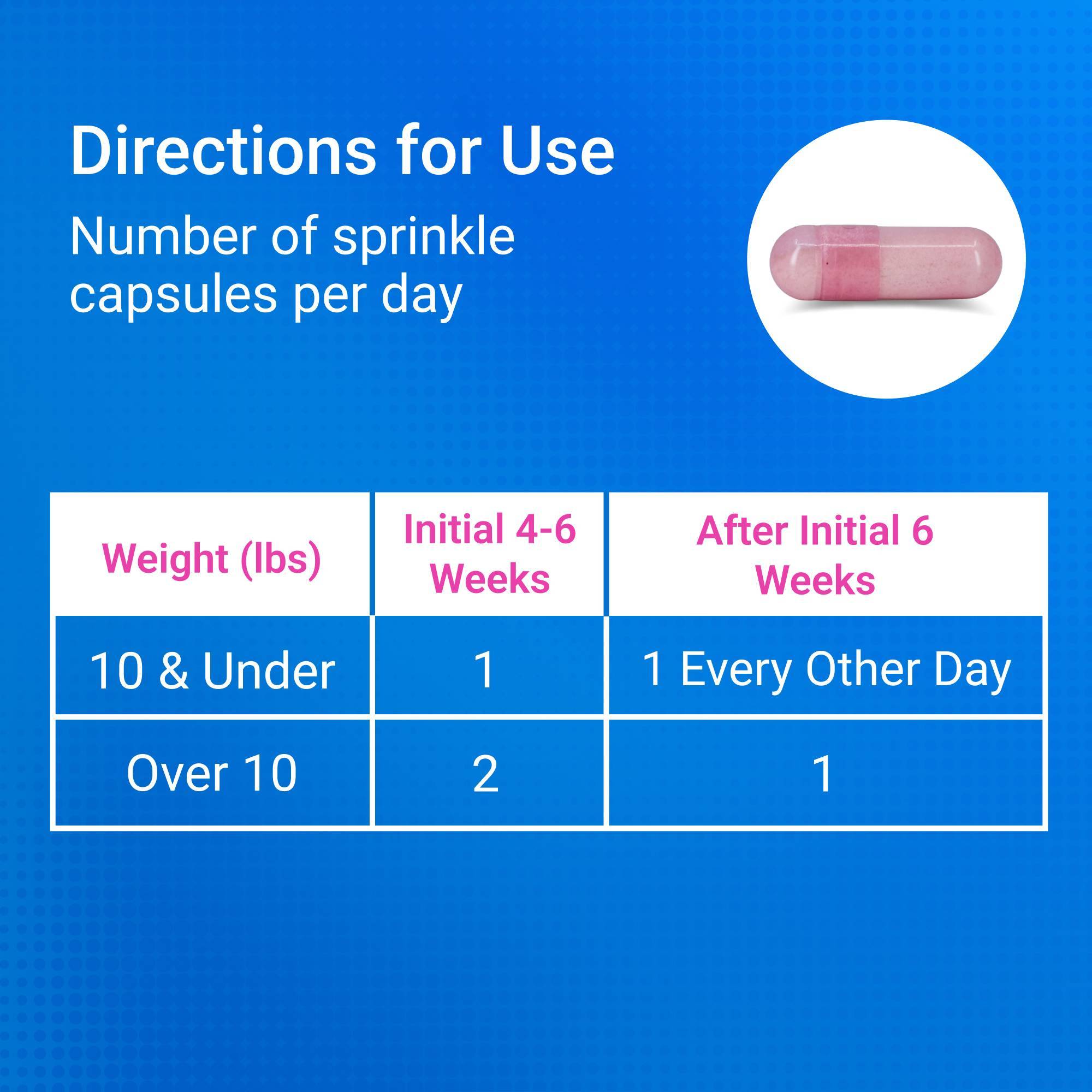 - Manufacturer's suggested use for initial 4 to 6 weeks: Cats under 10 lbs, 1 capsule sprinkled on food daily. Cats over 10 lbs, 2 capsules sprinkled on food daily.