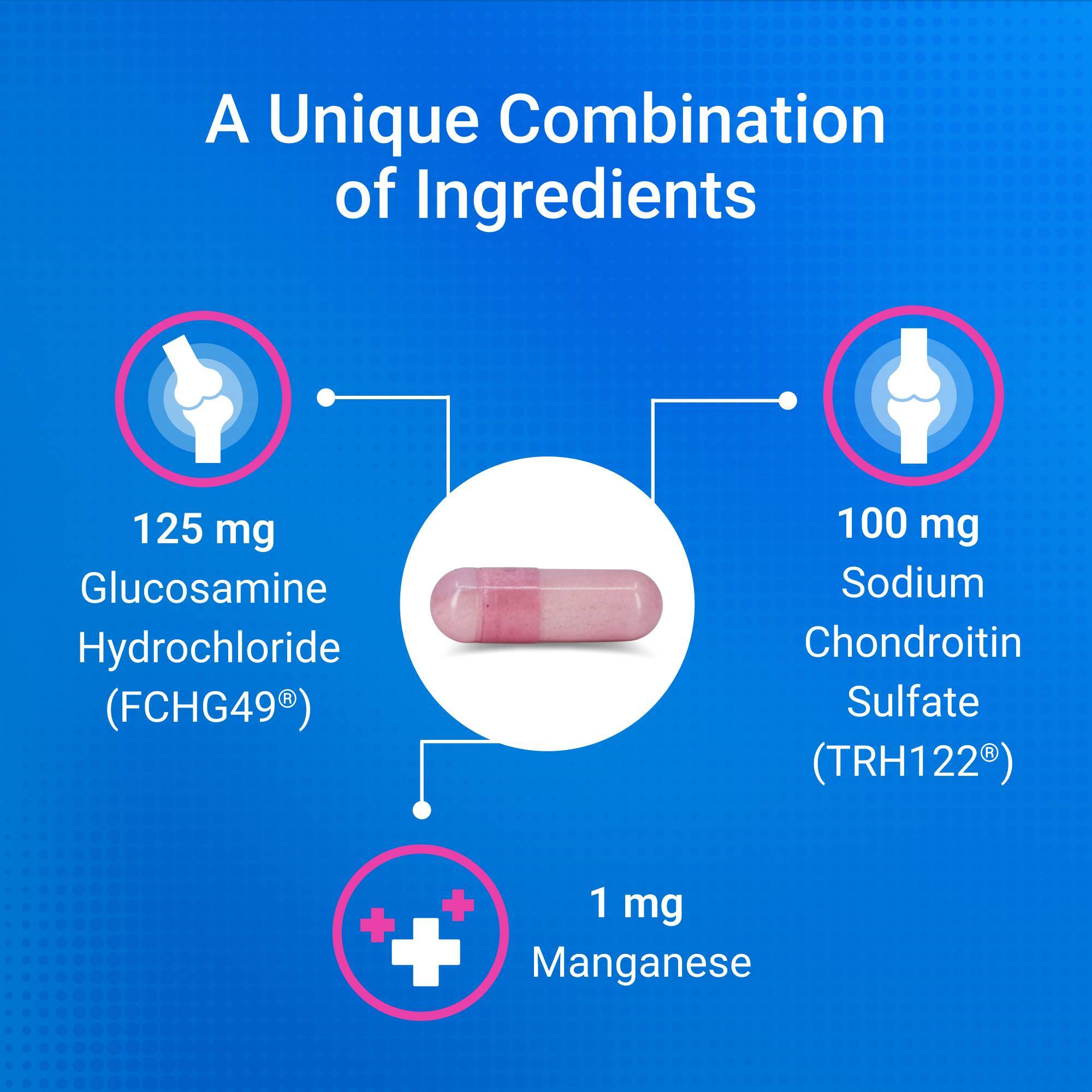 - Active ingredients per capsule: Glucosamine Hydrochloride 125 mg, Sodium Chondroitin Sulfate 100 mg, Manganese (Manganese Ascorbate) 1 mg.