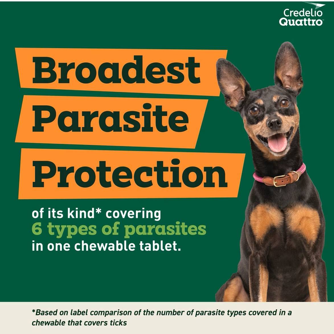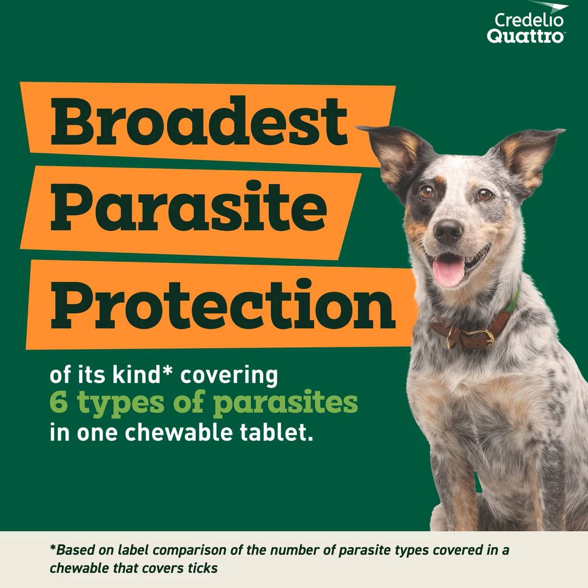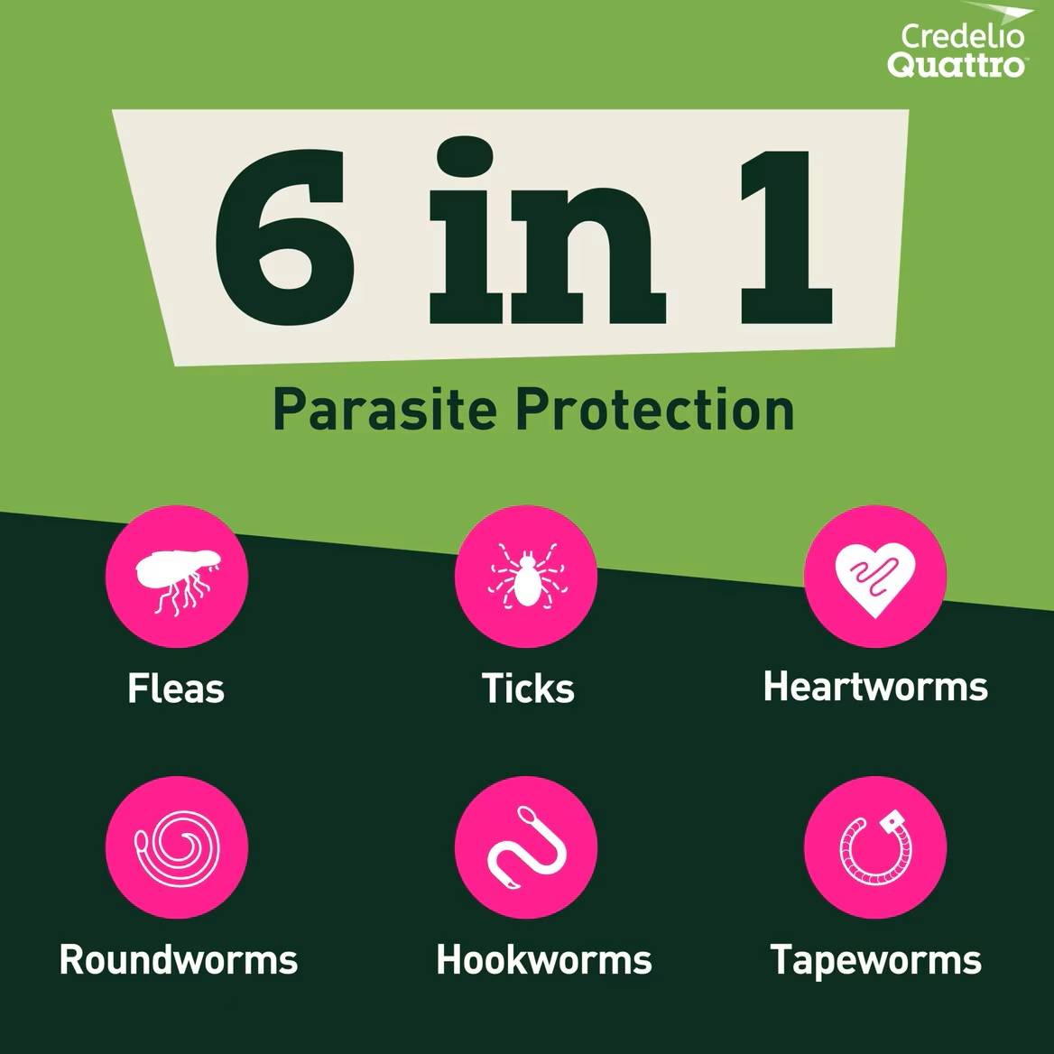- Credelio Quattro protects dogs and puppies against ticks, fleas, heartworm disease, roundworms, hookworms, and 3 species of tapeworms for one month.