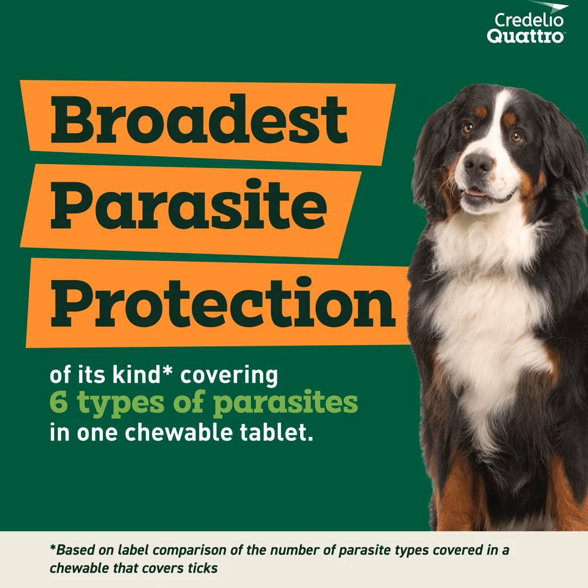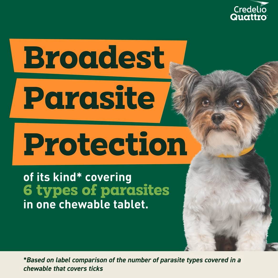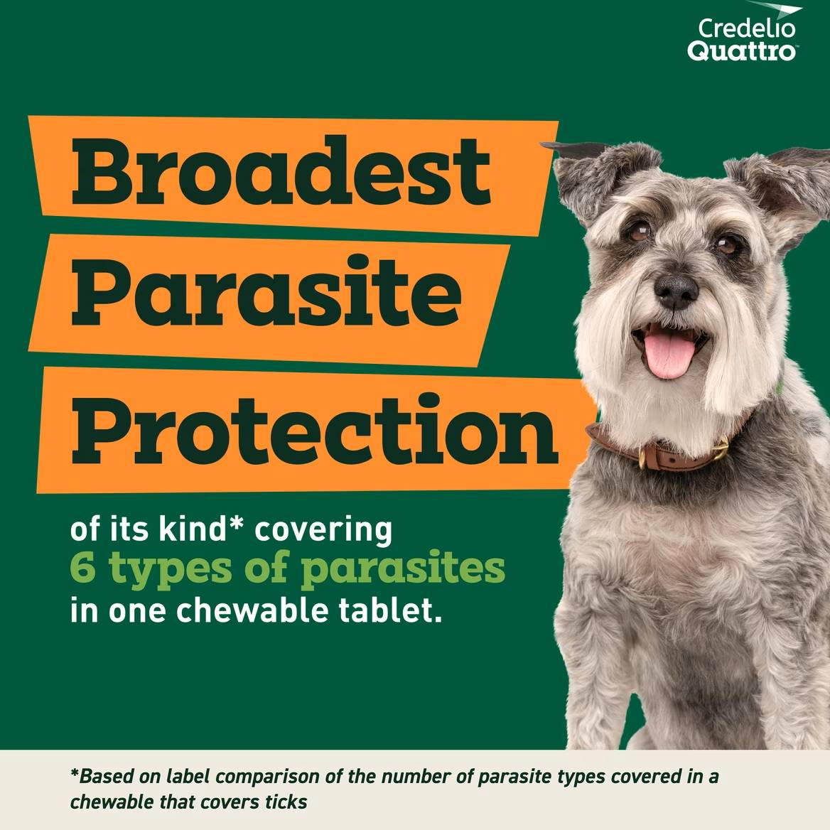 - Credelio Quattro protects dogs and puppies against ticks, fleas, heartworm disease, roundworms, hookworms, and 3 species of tapeworms for one month.