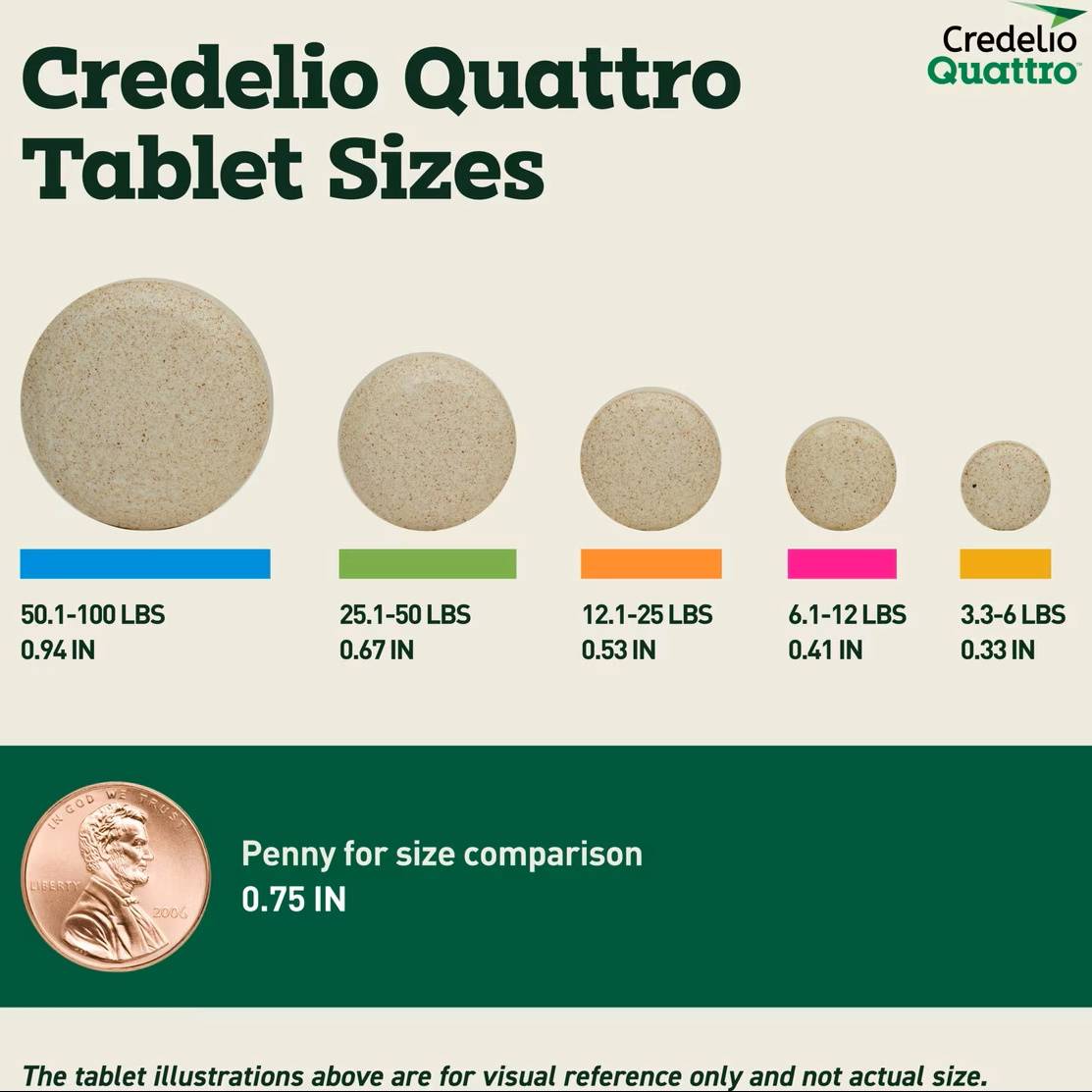 - Credelio Quattro is for dogs and puppies from 8 weeks of age and older, and weighing 3.3 pounds or greater.