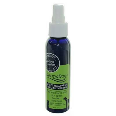DermaDog is a homeopathic topical spray for dogs that features complete natural ingredients. It helps relieve skin irritations such as hot spots, insect bites, or mild abrasions and reduce itching from minor skin allergies. DermaDog includes aloe vera juice to soothe skin, marigold extract as a natural antimicrobial, as well as tea tree, lavender, and carrot seed essential oils. Available in a 4 oz spray.