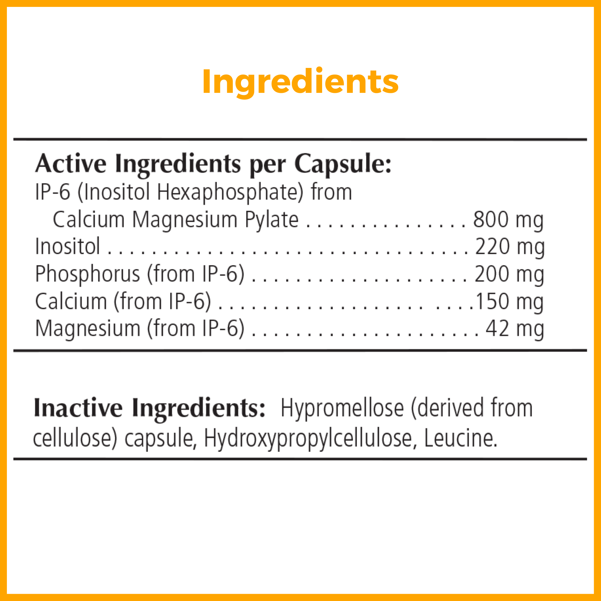 - Active Ingredients per capsule: IP-6 (Inositol Hexaphosphate) from Calcium Magnesium Pylate 800 mg, Inositol 220mg, Phosphorus (from IP-6) 200mg, Calcium (from IP-6) 150mg, Magnesium (from IP-6) 42 mg.