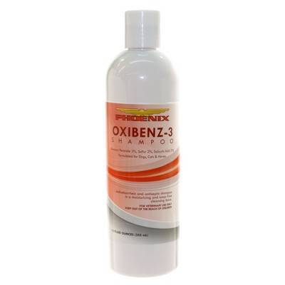 Oxibenz-3 is a shampoo for scaling and itching skin in dogs and cats with skin infections, seborrheic disorders and follicular plugging. This shampoo removes oil from your pet’s coat while helping reduce bacteria and fungus on your pet’s skin. It contains benzoyl peroxide, sulfur, and salicylic acid. With these ingredients, be aware that this shampoo may bleach colored fabrics.