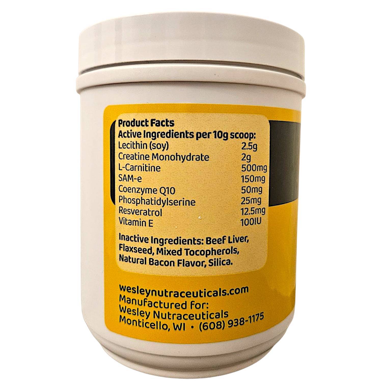 - Active Ingredients per 10g scoop: Lecithin 2.5 g, Creatine Monohydrate 2 g, L-Carnitine 500 mg, SAM-e 150 mg, Coenzyme Q10 50 mg, Phosphatidylserine 25 mg, Resveratrol12.5 mg, Vitamin E 100 IU.