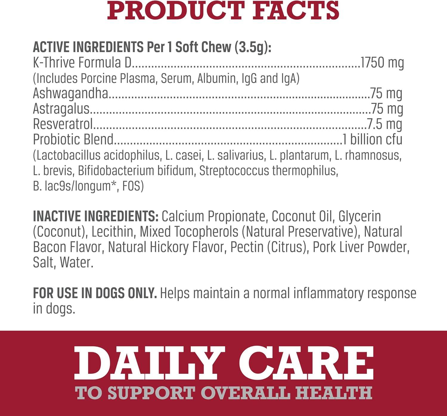 - Active Ingredients per 1 chew (5g): K-Thrive Formula D (includes porcine plasma, serum, albumin, IgG, and IgA) 2500mg, Balanced collagen 50mg.