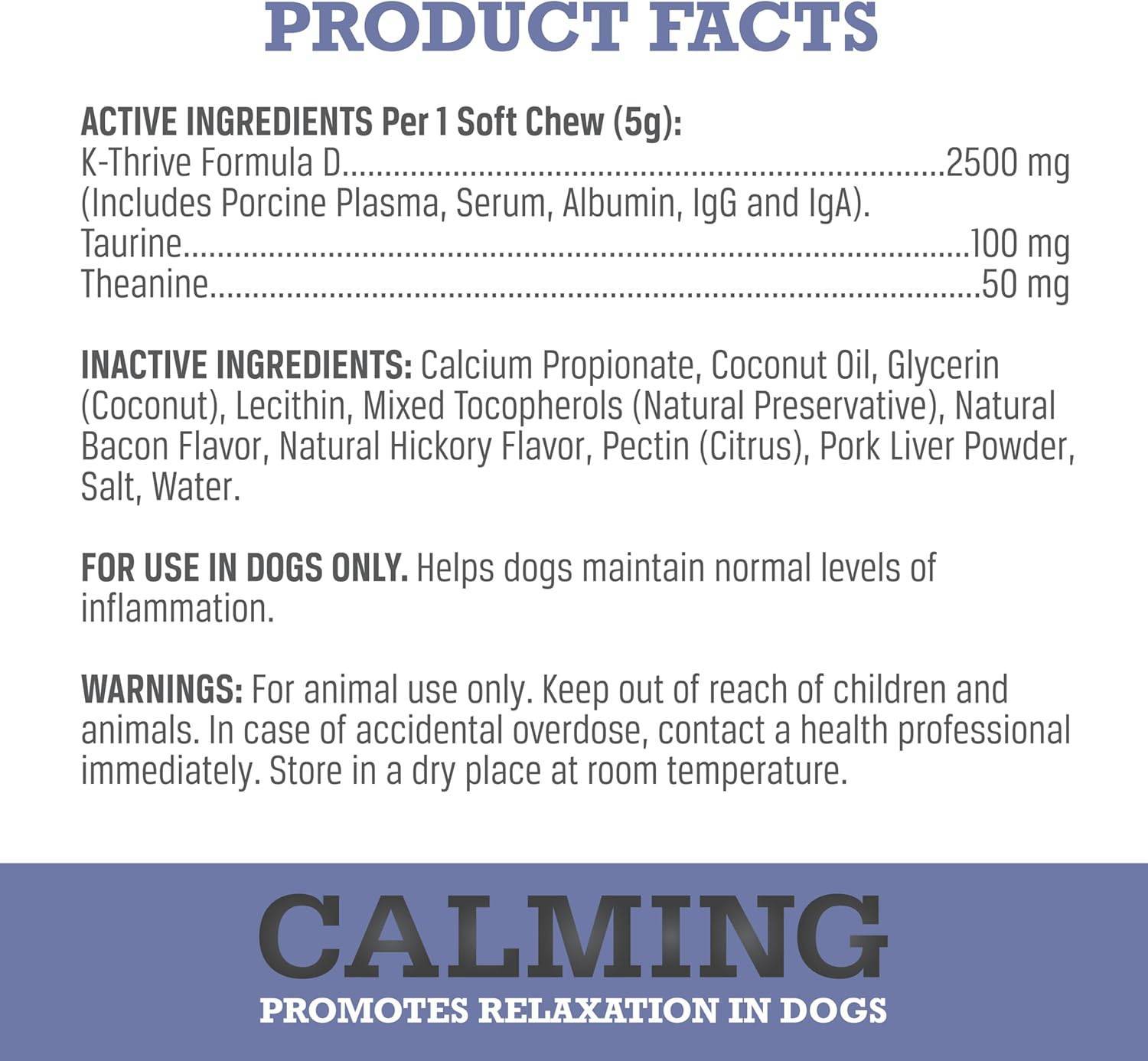 - Active Ingredients: K-Thrive Formula D (includes porcine plasma, serum, albumin, IgG, and IgA) 2500mg, Taurine 100 mg, Theanine 50mg.